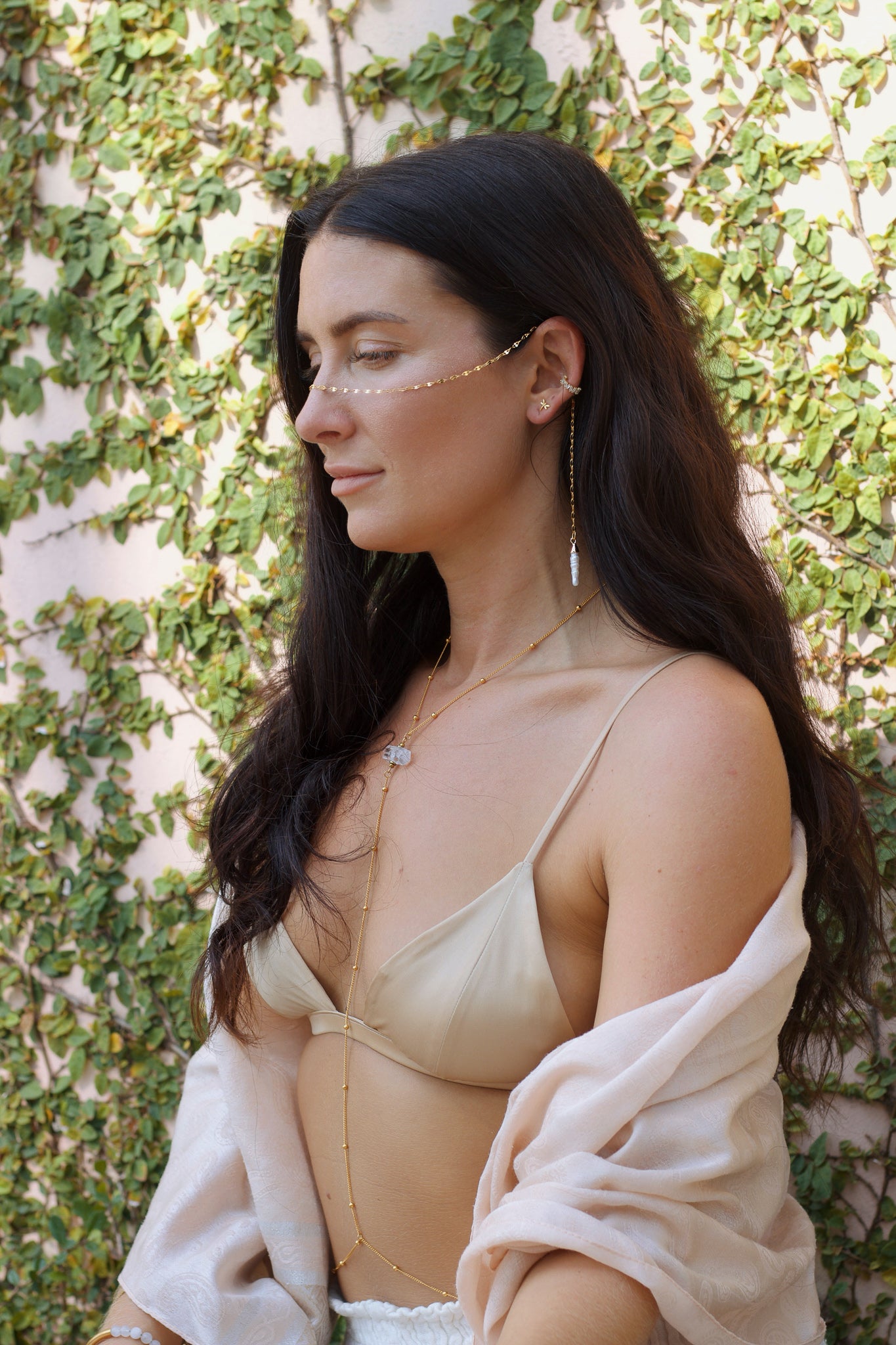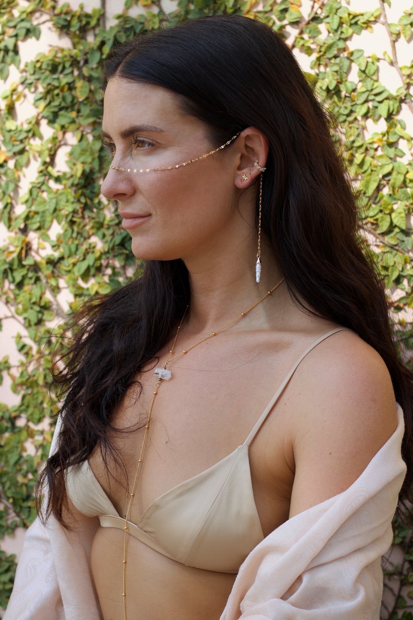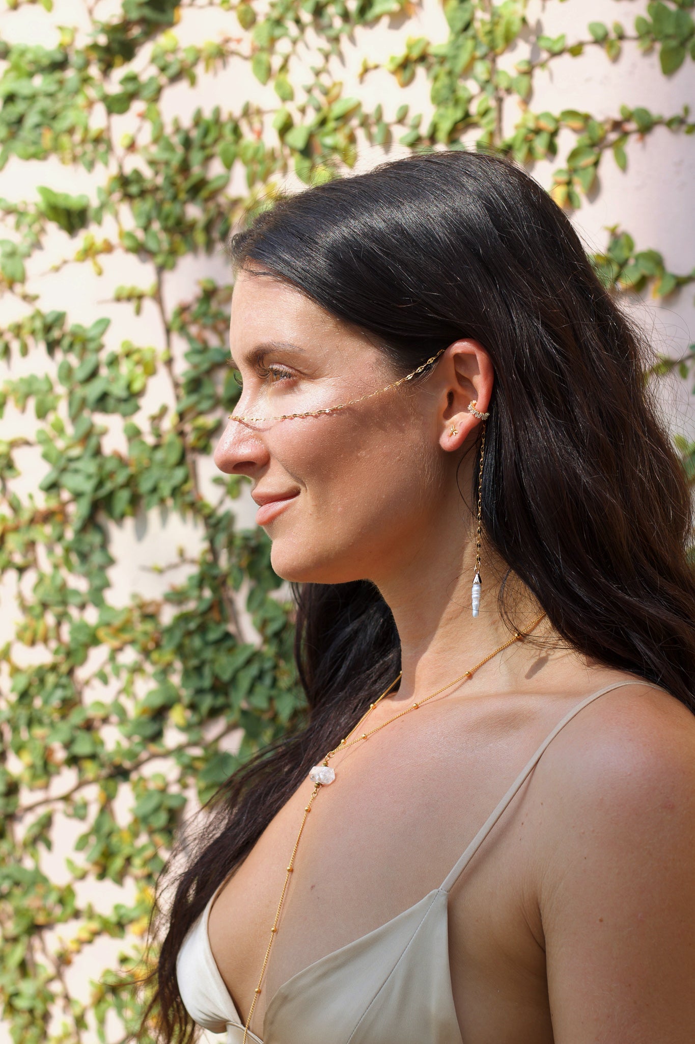 What I love about this piece is how it transforms with you. Drape it across your cheekbones for weddings or festivals when you want to feel otherworldly. Or loop it as a tie necklace for coffee dates, letting one pearl rest higher on your chest while the other cascades lower - it's like having two completely different pieces in one.