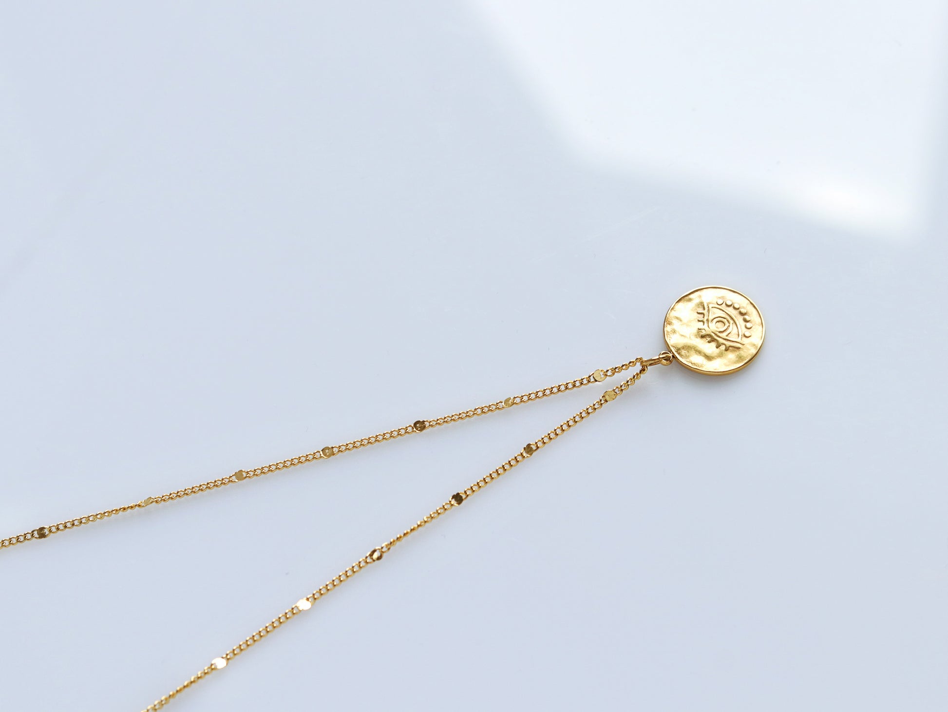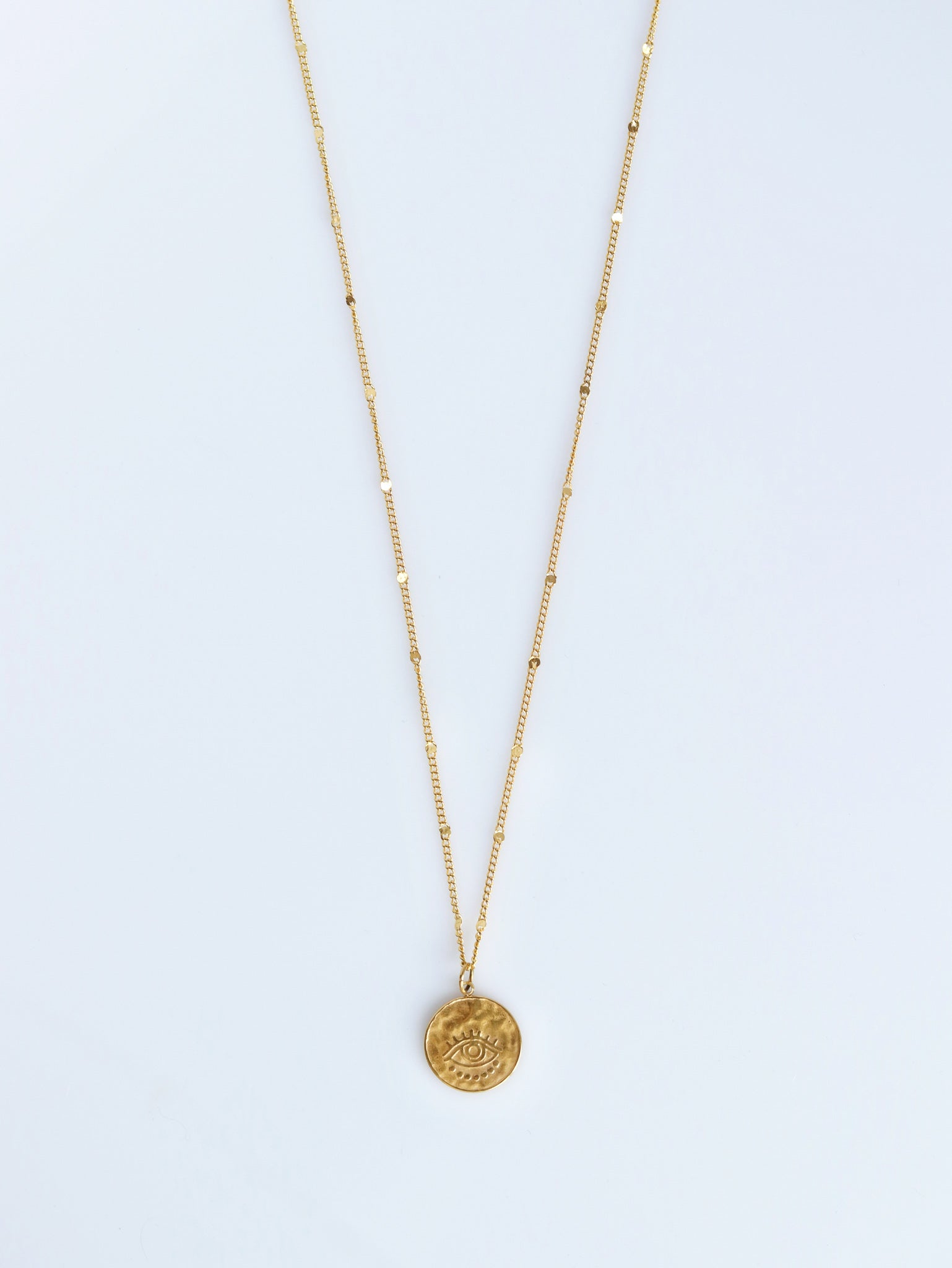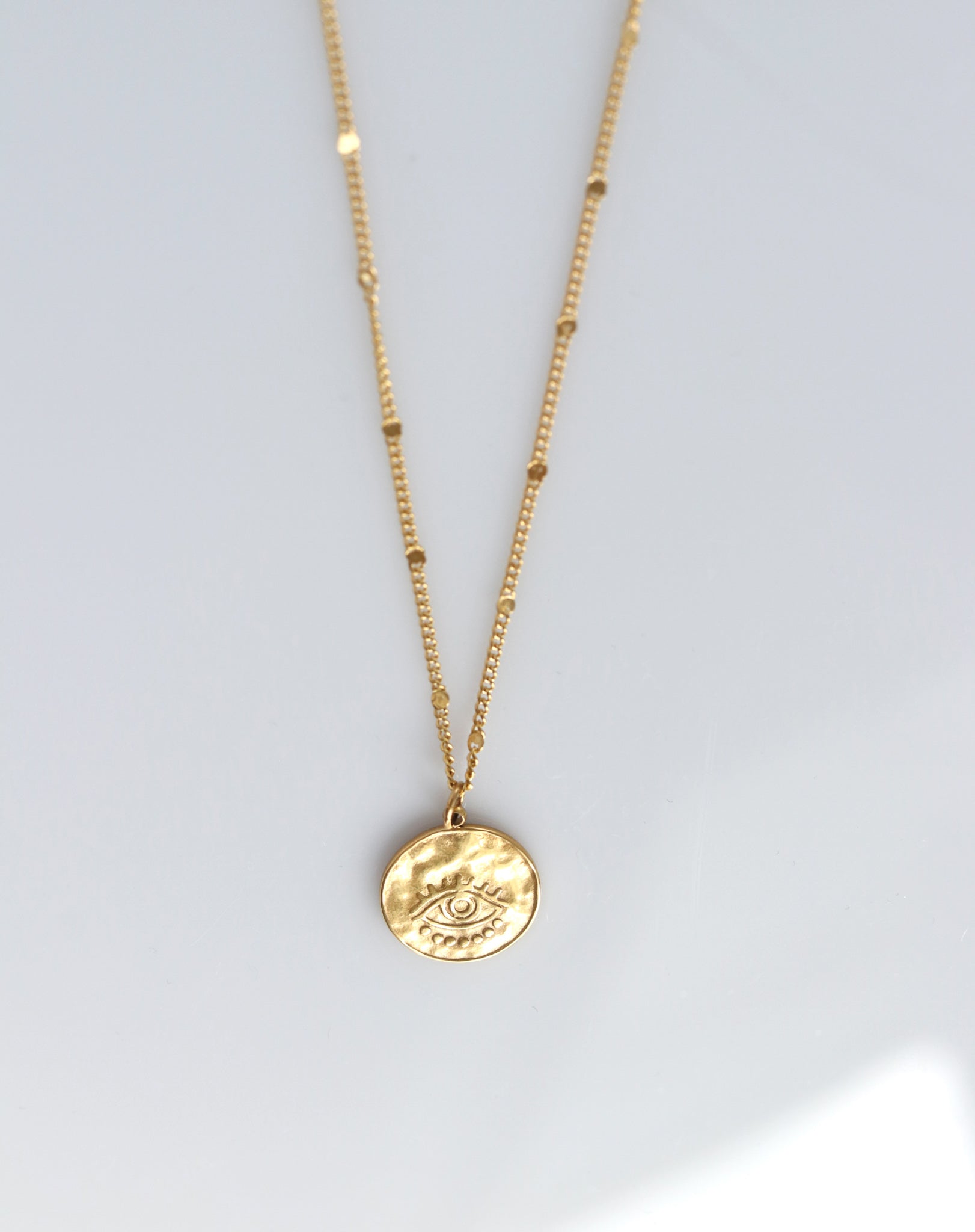 The Mystic Eye necklace carries ancient wisdom in a beautifully hammered coin pendant, with the protective eye symbol adorning both sides to watch over you from every angle. Crafted from premium stainless steel and bathed in 18K gold Ion Plating, this piece flows with mystical elegance on a delicate curb chain dotted with tiny light-reflecting discs.
