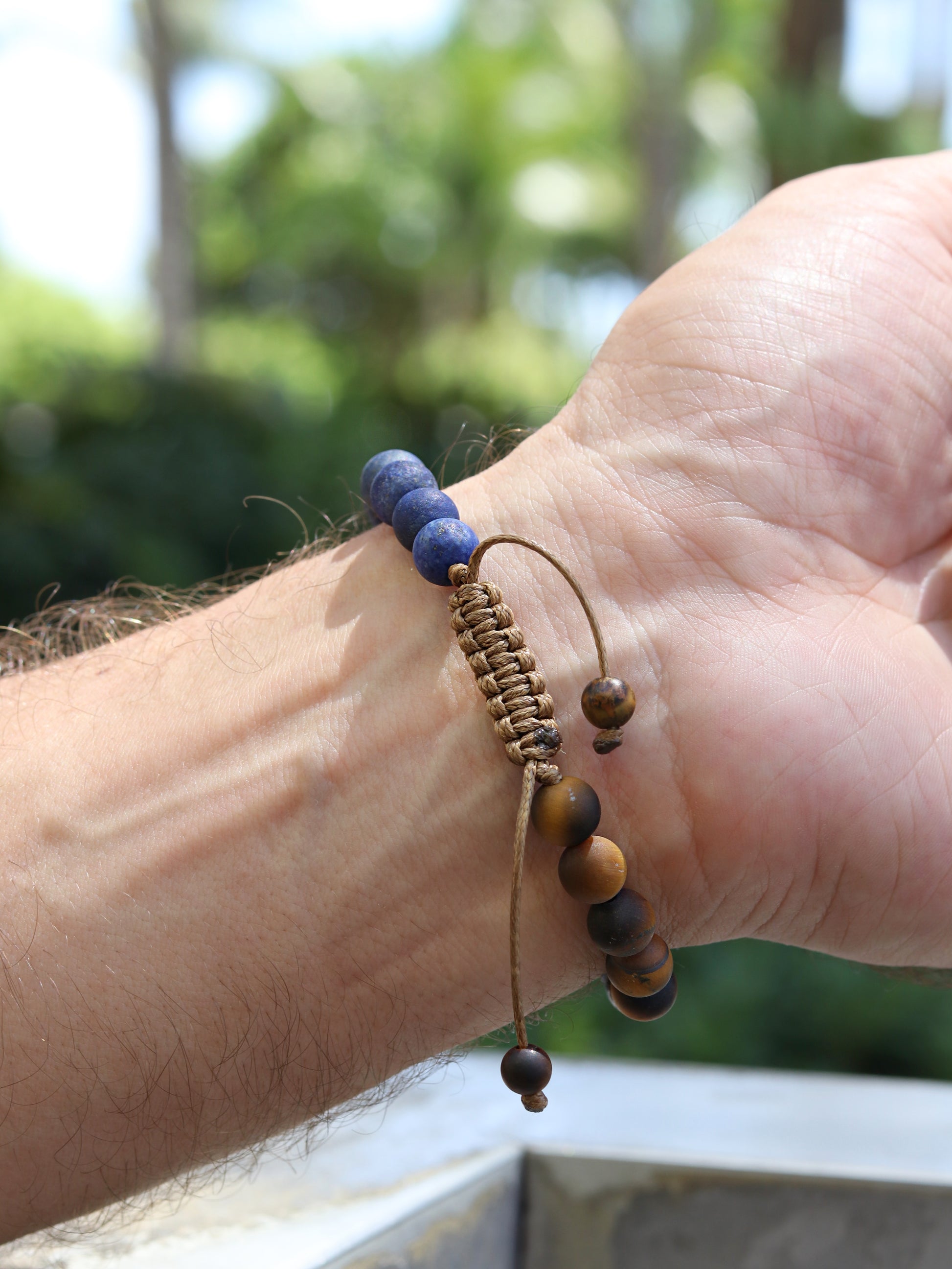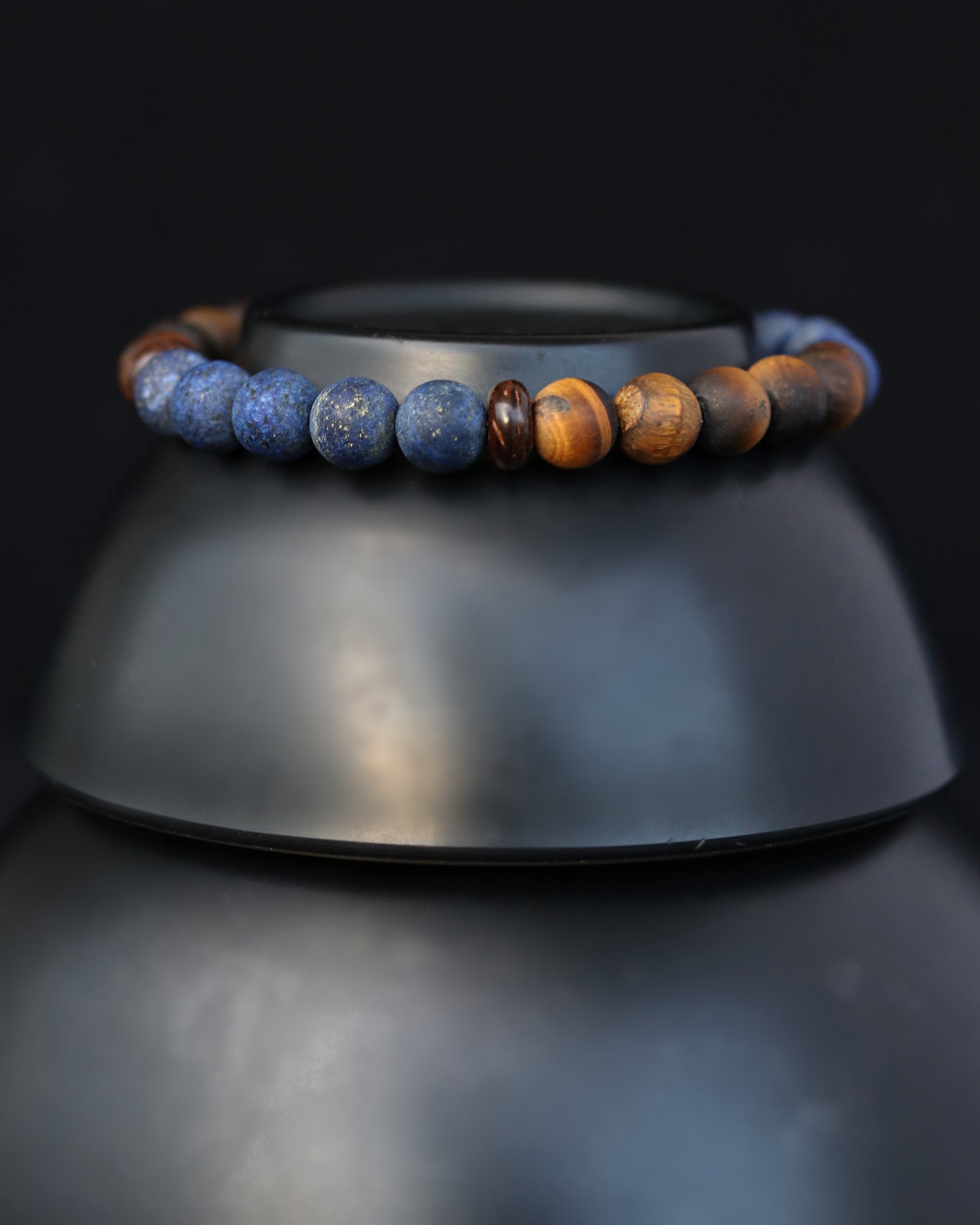 This elegant gentleman's bracelet combines the ancient wisdom of matte Lapis Lazuli with the grounded power of Tiger's Eye, creating a harmonious balance of spiritual insight and practical strength. Each 8mm stone works in perfect synergy to support the conscious man's journey of authentic self-expression and purposeful action.