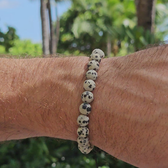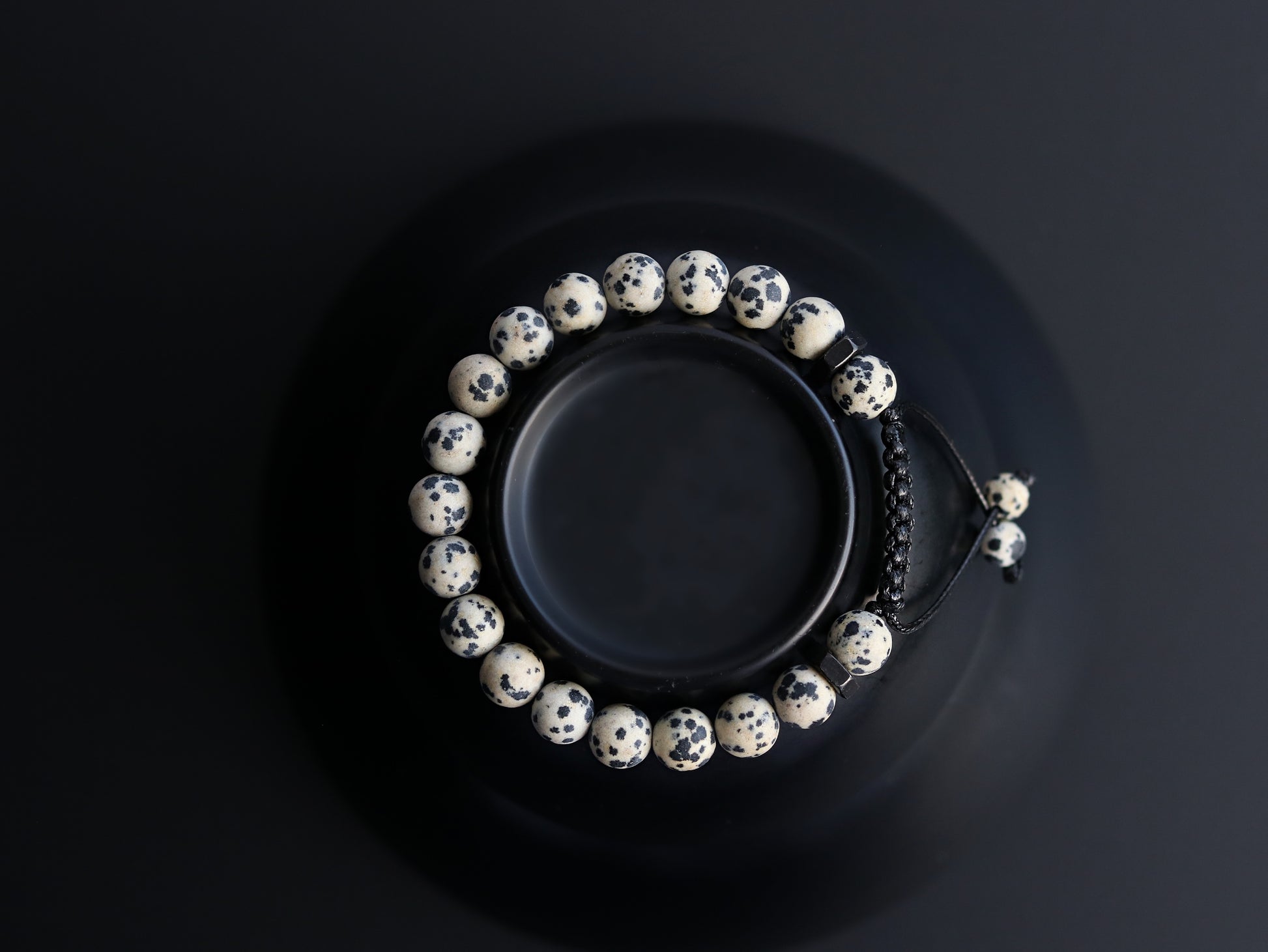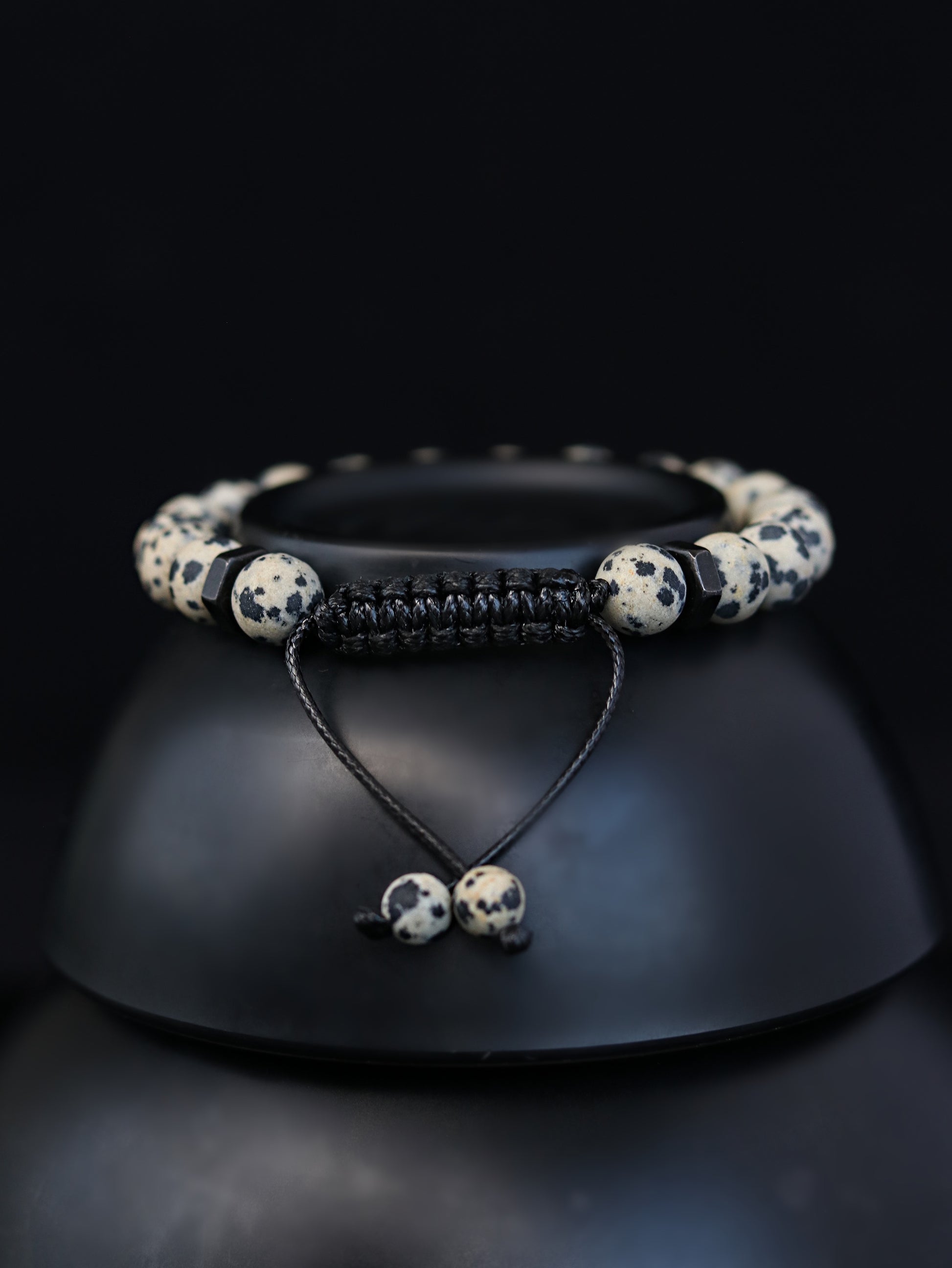 Bold, minimal, and made for everyday wear - this men’s braceletis made with 8mm matte Dalmatian Jasper beads with a clean black-and-white pattern. It’s finished with an adjustable macrame sliding knot so you can adjust it to a perfect fit.