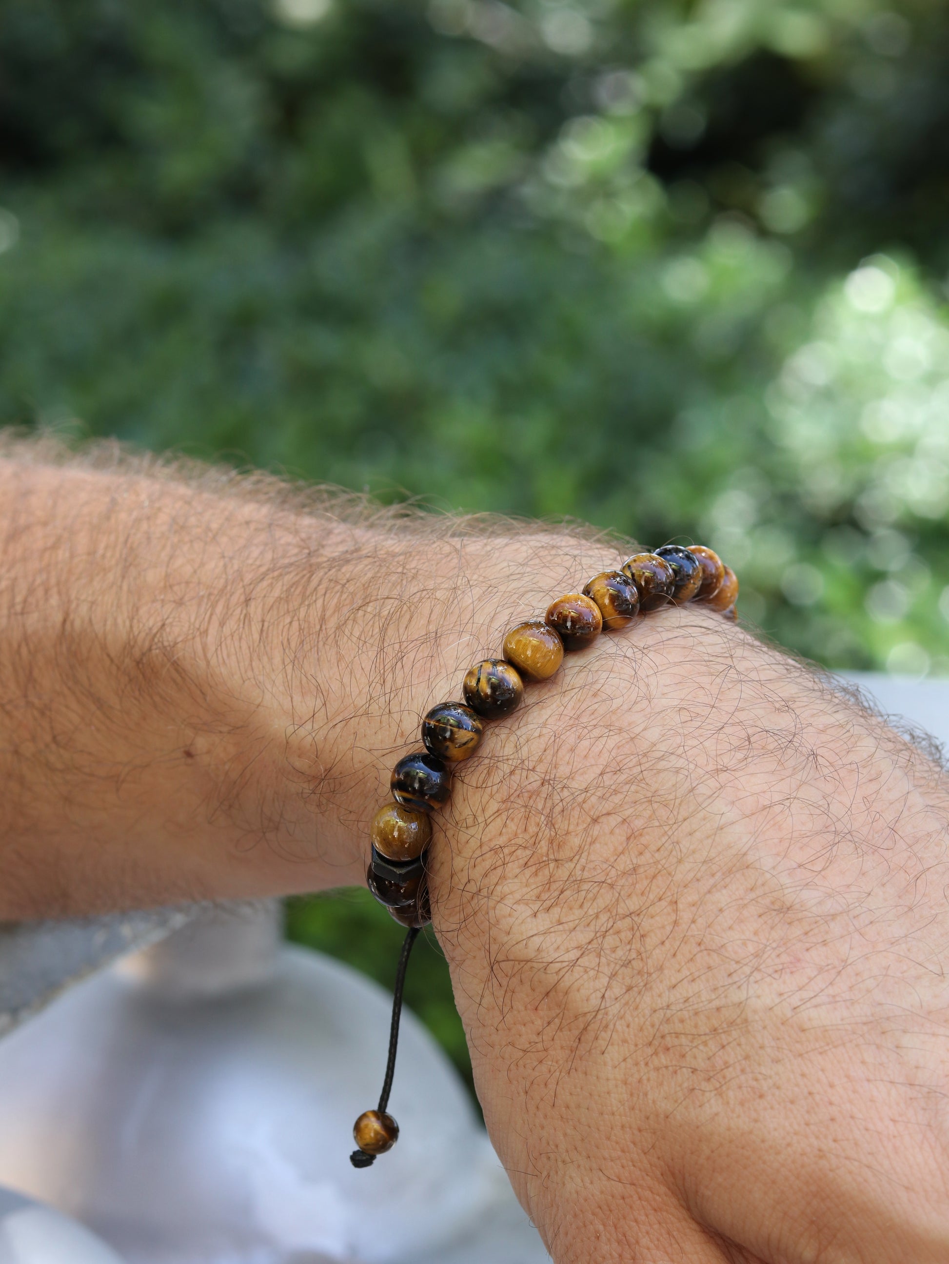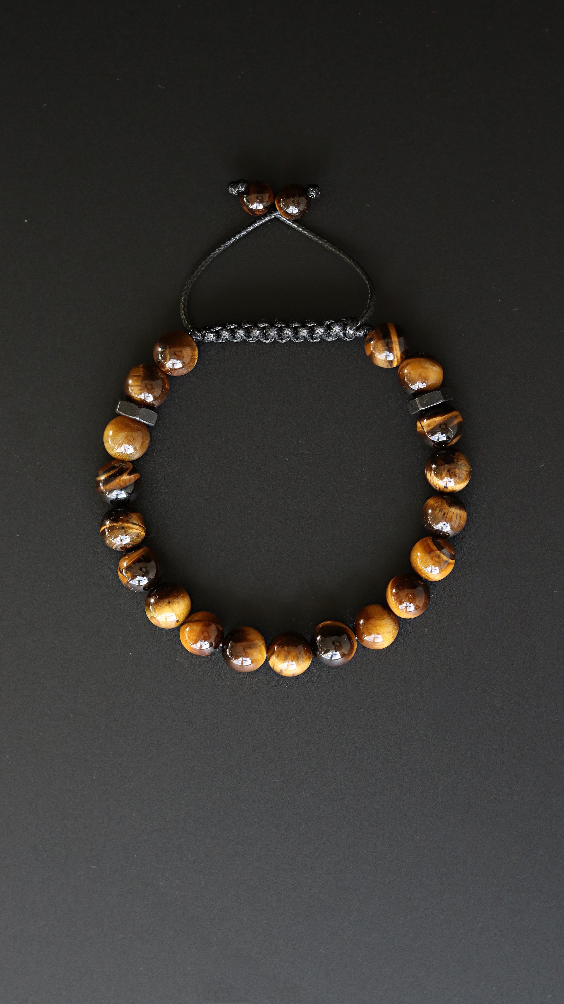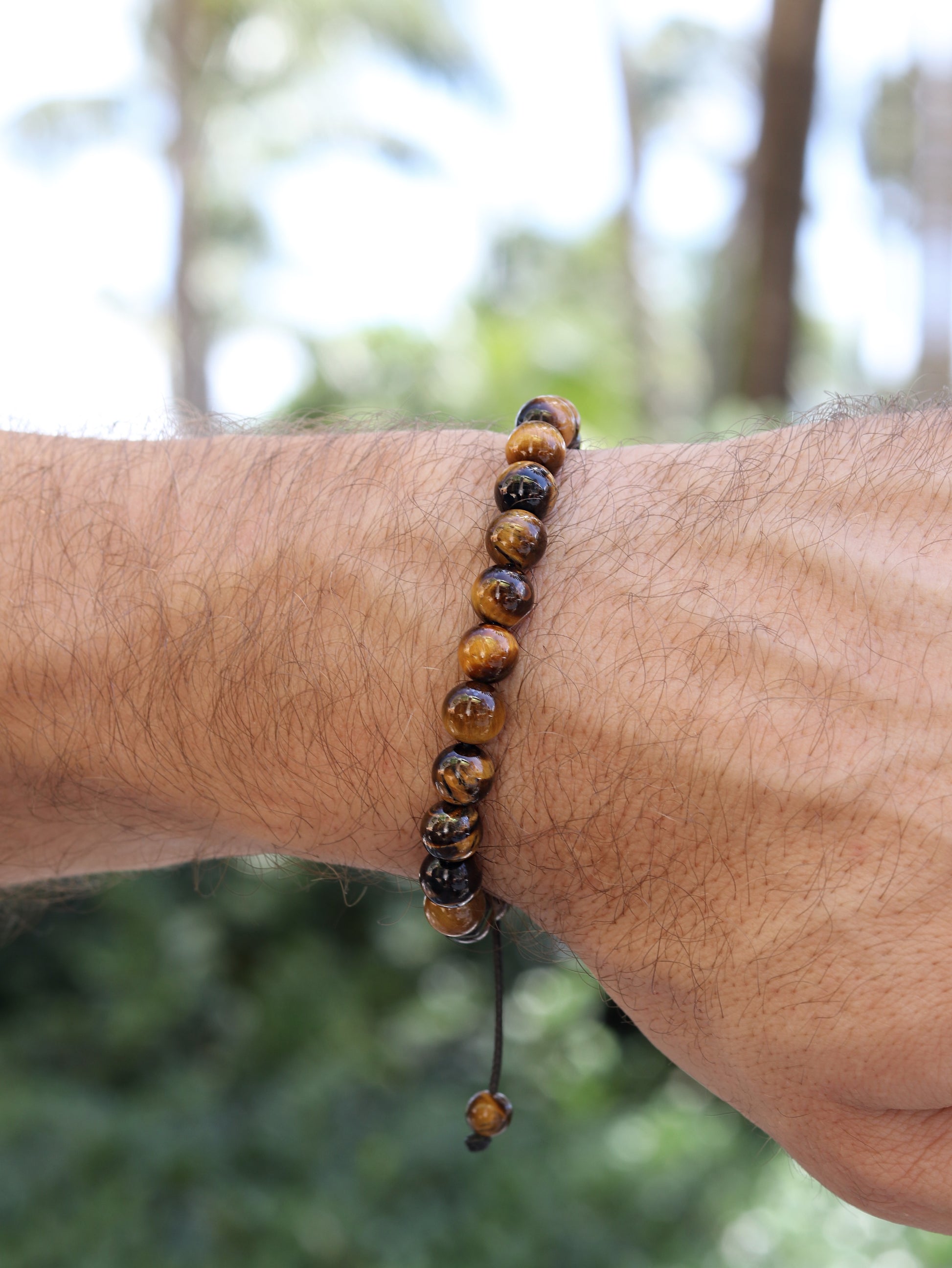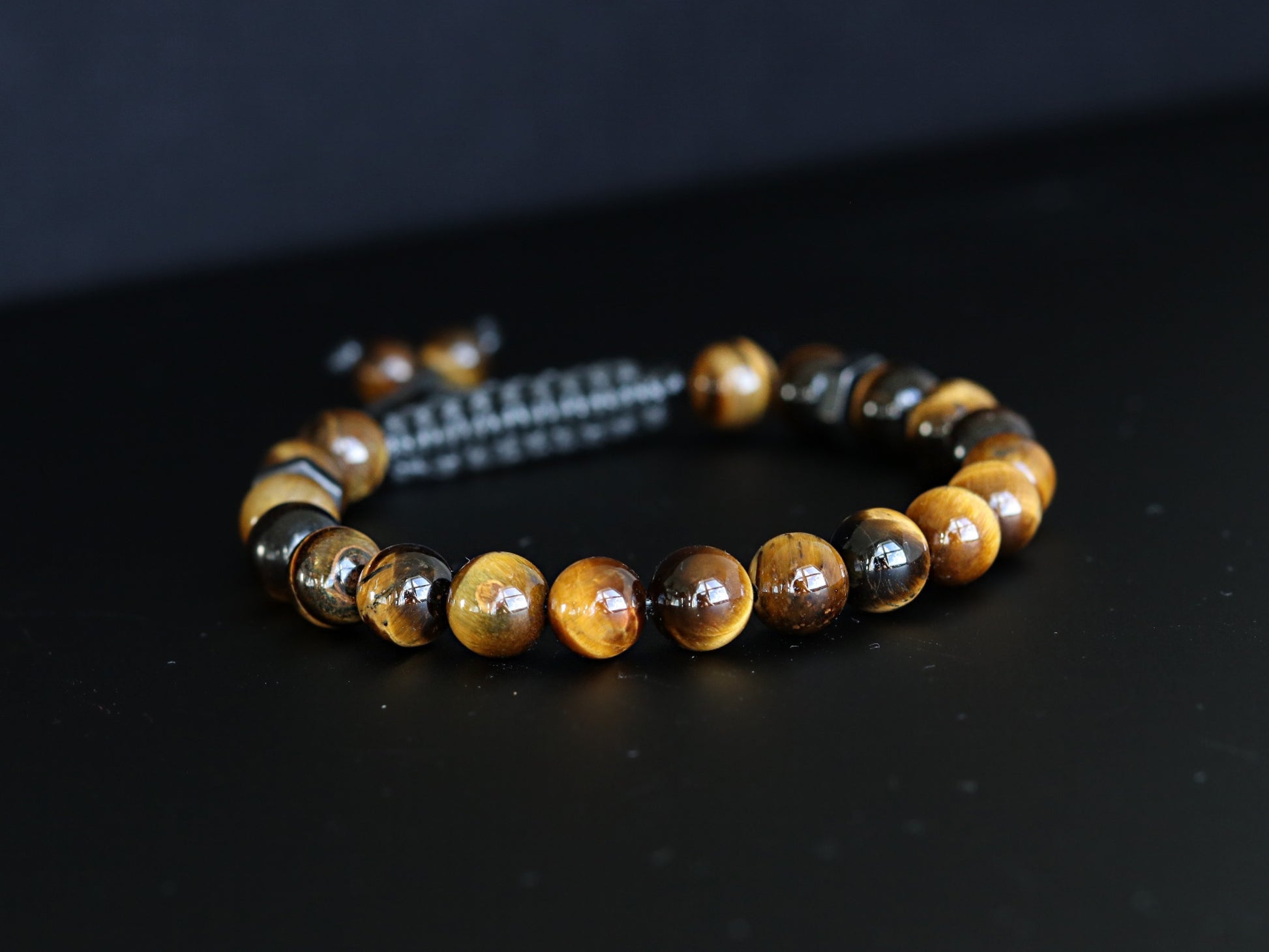 Polished Tiger’s Eye Men’s Bracelet — a clean, minimal piece with rich brown and golden tones that catches the light without being flashy. Made with genuine 8mm Tiger’s Eye beads, black stainless steel accents, and a durable adjustable macramé closure for an easy everyday fit.
