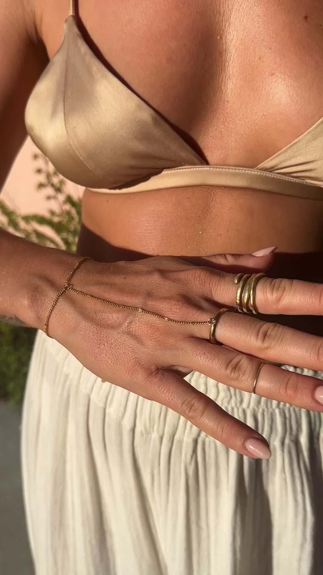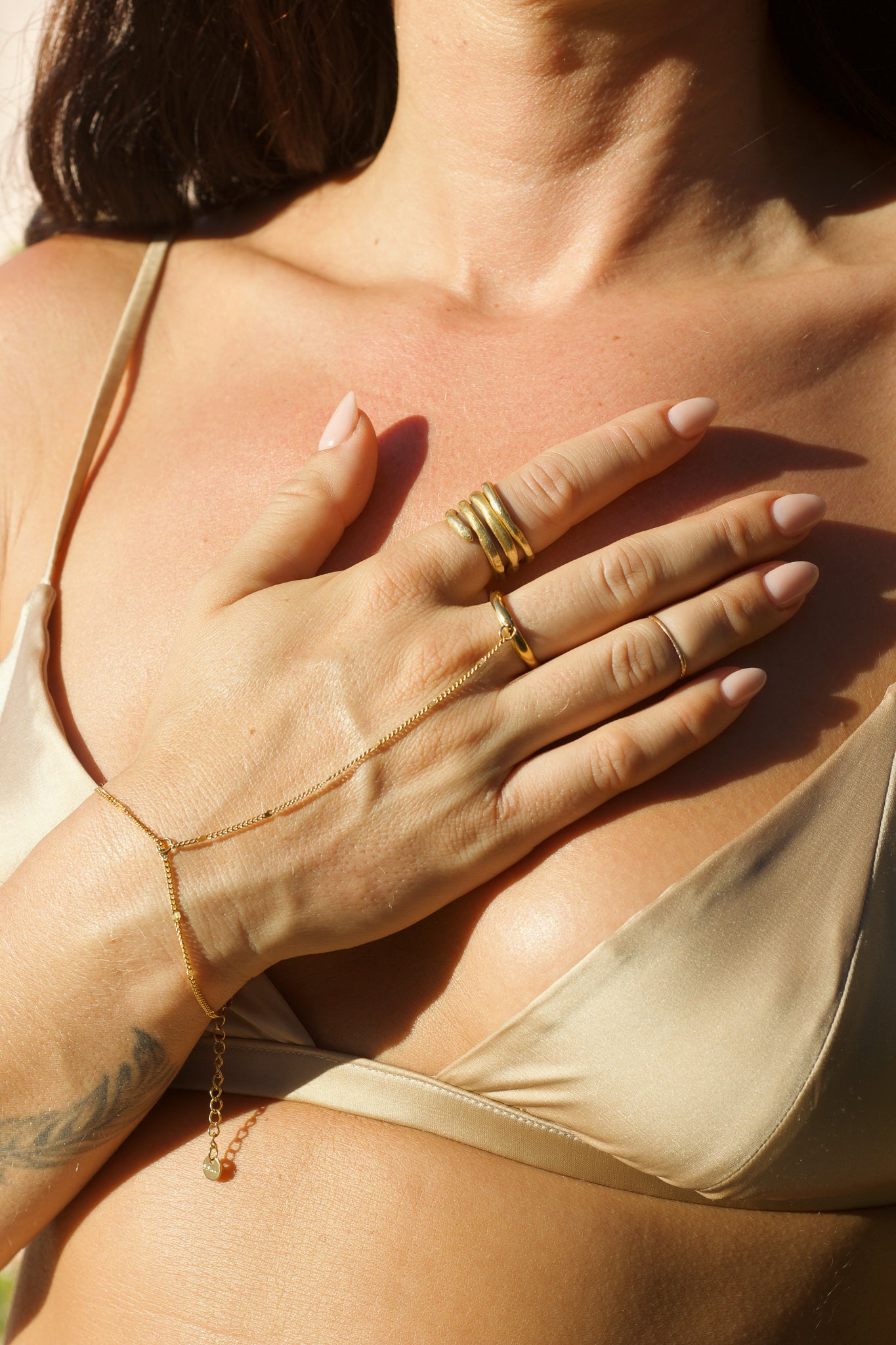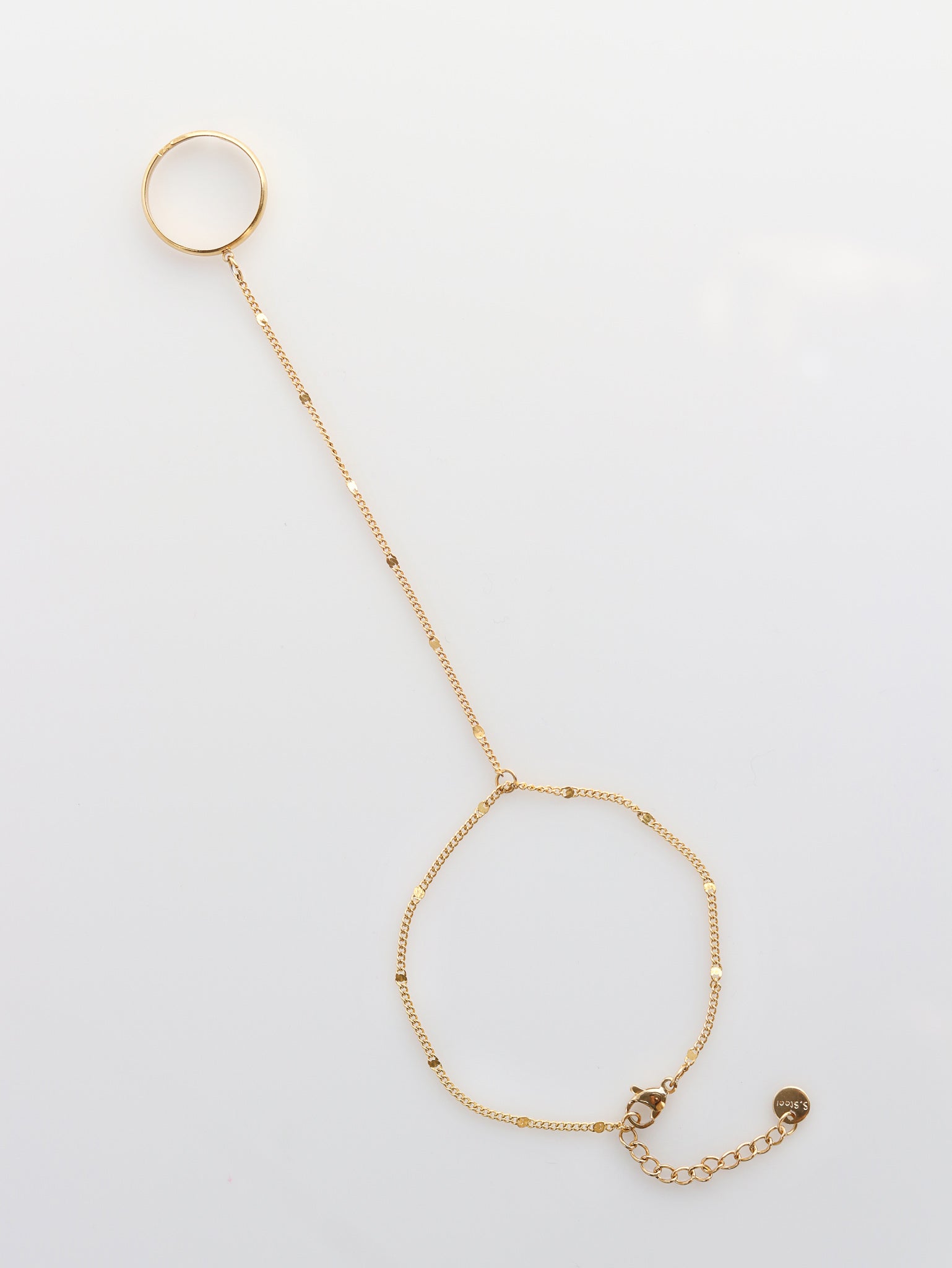 Radiance ring hand chain is made with stainless steel base and it is gold Ion Plated with 18k gold. (More info about the type of the gold plating see below)