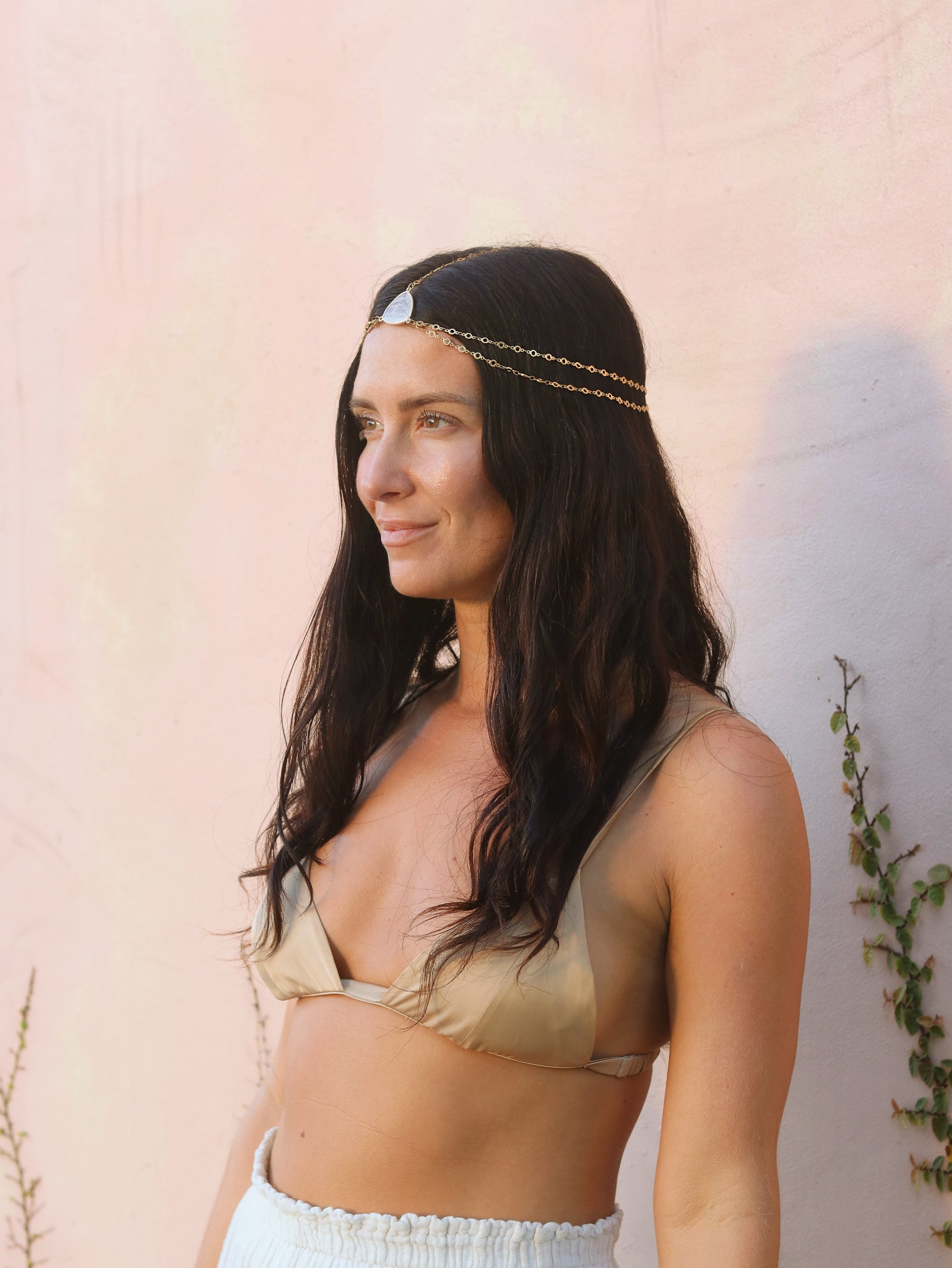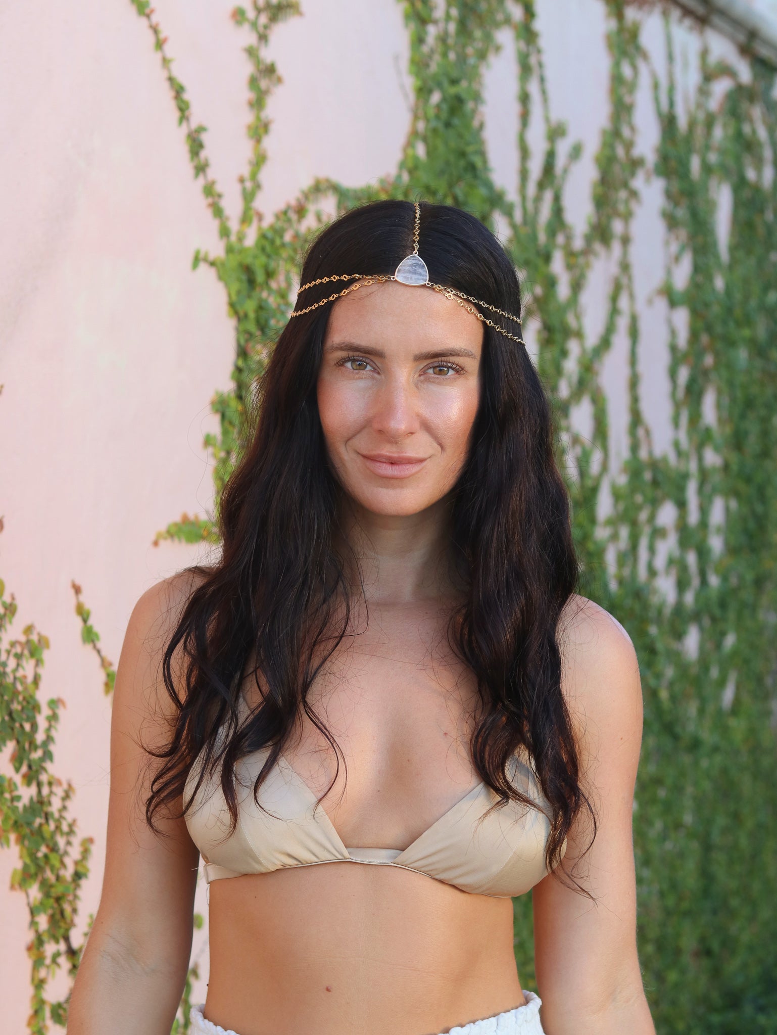 Oriental Fantasy headpiece is made with faceted triangle Quartz crystal as centerpiece. Chains falling along sides of the head are round flat circle chain links connected at the back of the head and embellished with a Half Sun charm.